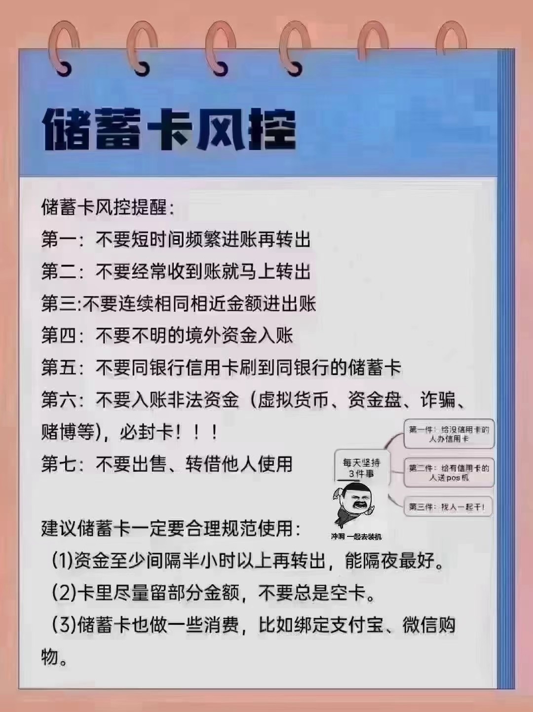 所以,想要避免储蓄卡被银行冻结,一定要避开以上所将的几点,尽可能做到不要触碰银行的风控线。