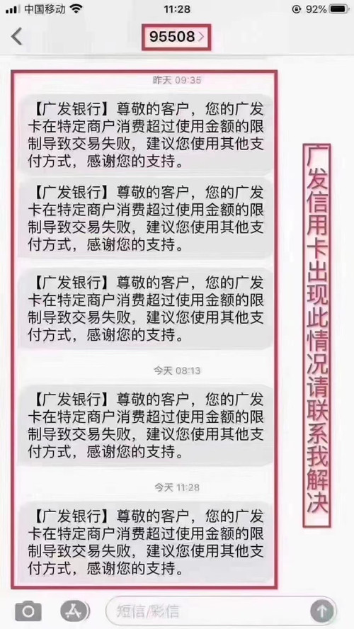 如果你的广发卡在交易的时候给发短信提醒了,那么说明被广发银行限制了,只能换POS机或使用其它方式进行交易了,比如使用盛付通POS机和扫码线上交易等方式。盛付通POS机,专业解决广发卡受限问题;而线上交易除了扫码交易外,还有快捷支付等方式可以进行交易,这些也都能避开广发银行的限制问题。